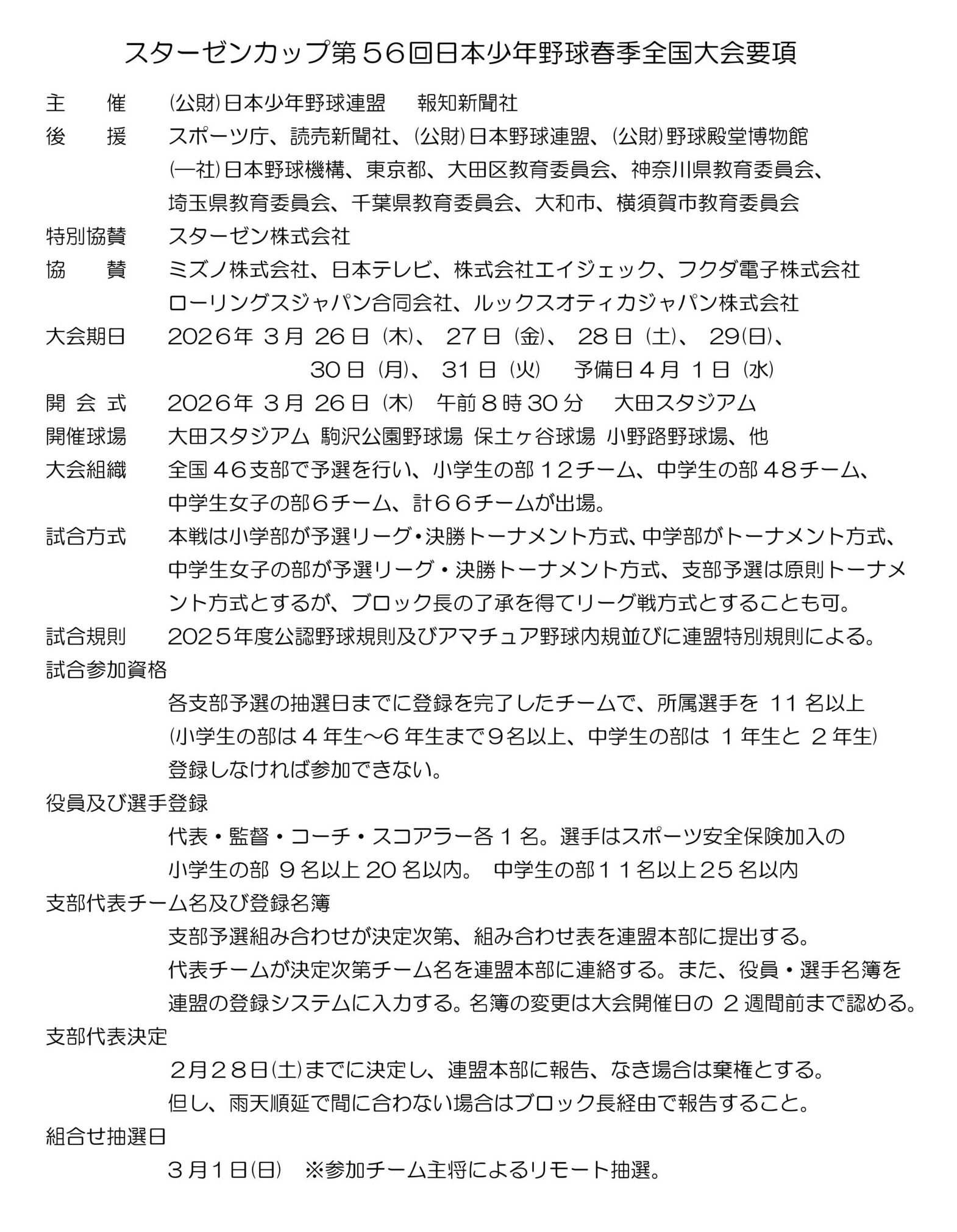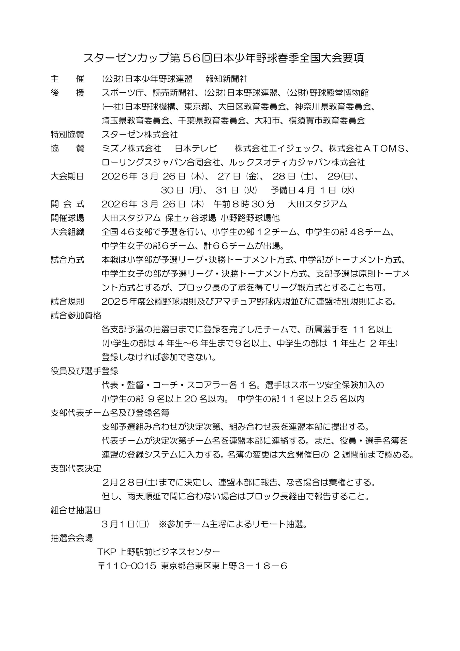 スターゼンカップ 第56回日本少年野球春季全国 使用球場と試合時間