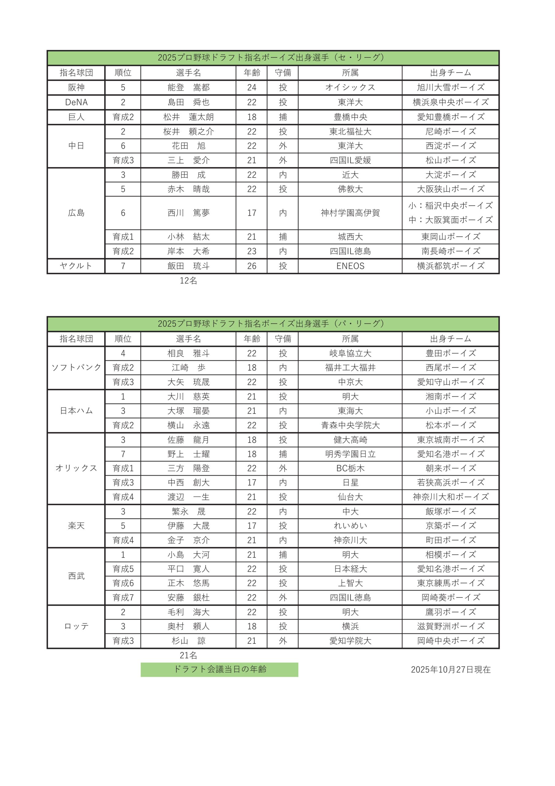 【2025ドラフト会議】ボーイズリーグ出身選手を掲載いたしました。