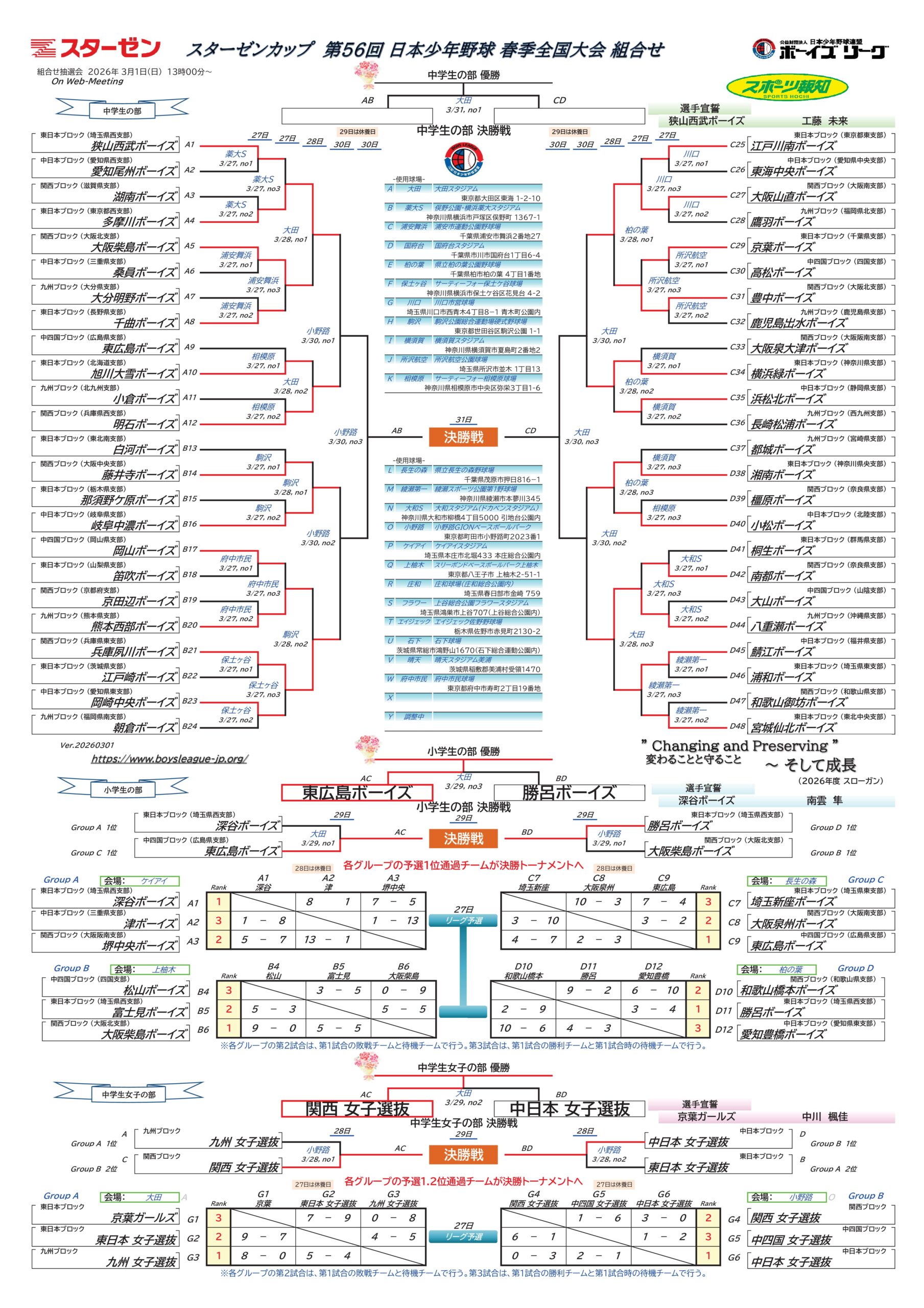 大会情報 【3/29 結果】スターゼンカップ 第56回 日本少年野球 春季全国大会 2026.03.29 今大会から新設された中学生女子の部の初代女王に輝いたのは、関西女子選抜! 小学部決勝戦、激闘を制したのは、東広島ボーイズ。3年振りの全国制覇! 【試合結果】スターゼンカップ 第56回 日本少年野球 春季全国大会 中学生女子の部 【試合結果】スターゼンカップ 第56回 日本少年野球 春季全国大会 小学生の部 Tweet Share Hatena Pocket RSS feedly Pin it 中学生女子の部紹介動画_スターゼンカップ 第56回 ... 【閉会式_小学生、中学生女子の部】スターゼンカップ ...